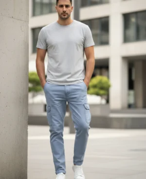 Men’s Slim-Fit Light Blue Cotton Cargo Trousers – Casual Utility Pants | John Vesture