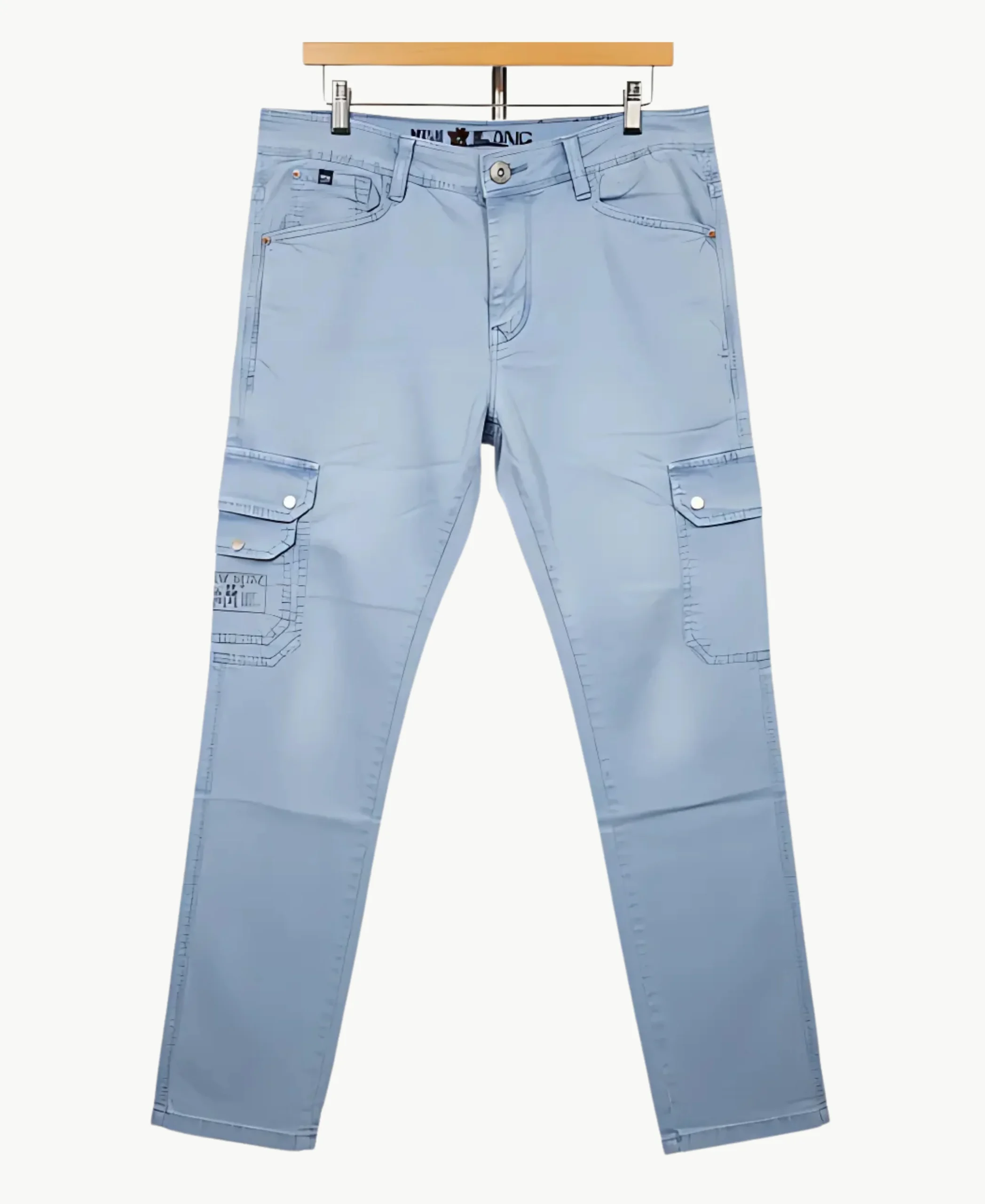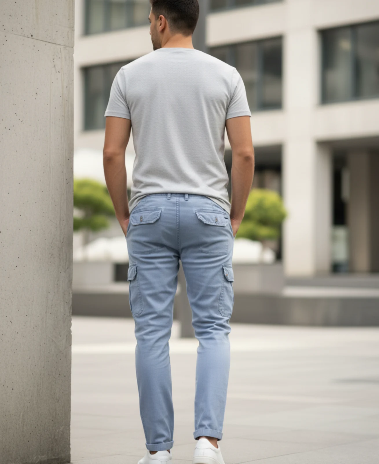 Men’s Slim-Fit Light Blue Cotton Cargo Trousers – Casual Utility Pants | John Vesture