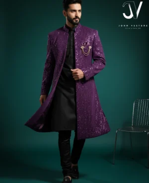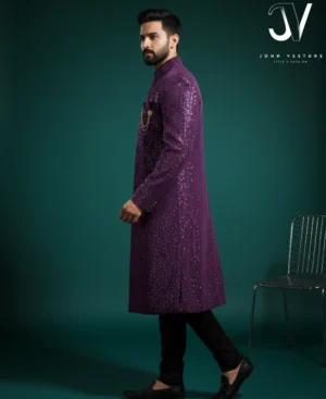 The Royal Plum Jaquard Diamond Pattern Sherwani | John Vesture